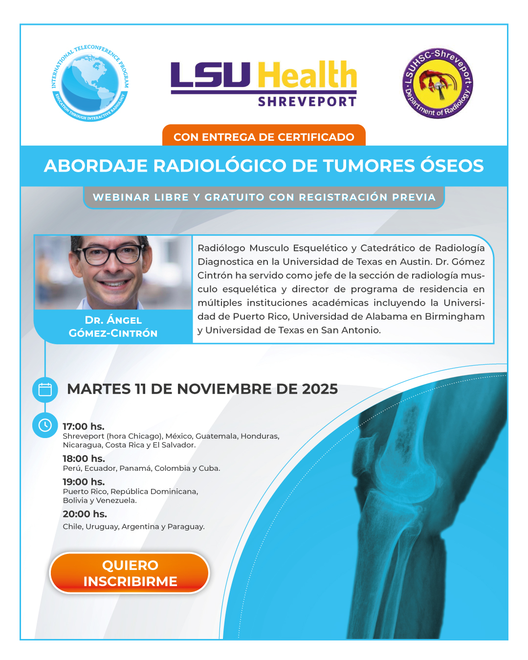 Webinar libre y gratuito11nov20:0021:00Abordaje radiológico de tumores óseosInternational Teleconference Program (ITP)20:00 - 21:00(GMT-03:00) Ver en mi horario
