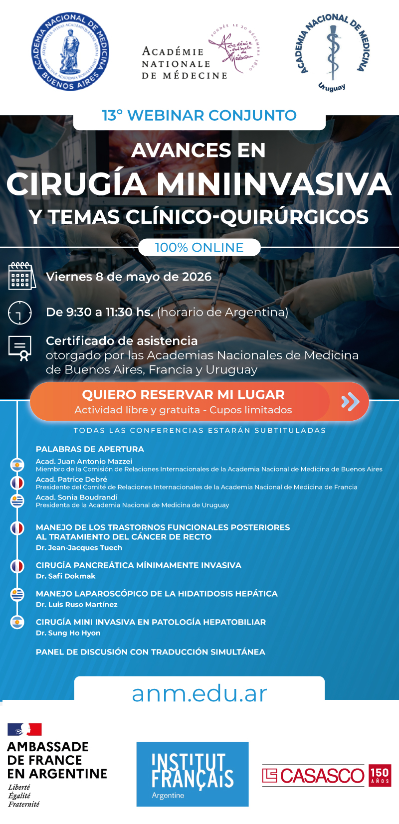 08may09:3011:30Webinar libre y gratuitoAvances en Cirugía Miniinvasiva y temas clínico-quirúrgicosAcademias Nacionales de Medicina de Buenos Aires, Francia y Uruguay09:30 - 11:30(GMT-03:00) Ver en mi horario