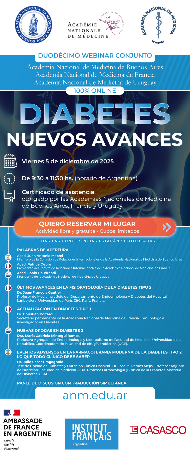 Webinar libre y gratuito05dic09:3011:30Diabetes: nuevos avancesAcademias Nacionales de Medicina de Buenos Aires, Francia y Uruguay09:30 - 11:30(GMT-03:00) Ver en mi horario